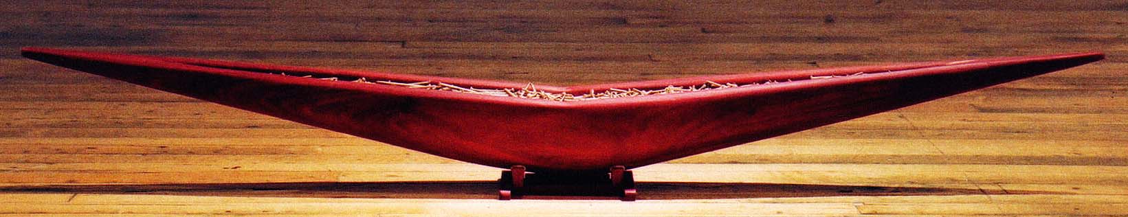 Two vessels, carved and shaped by hand from salvaged Brazilian bloodwood using mallets, chisels and Japanese hand planes, represent true and magnetic north forming the boundaries of our variations. They are the edges of the page, the horizon lines of our intellect and clearly there for us to transverse. In the vessel representing magnetic north you can smell the organics of the earth. It is filled with an essence ‘Bakhoor’ prepared for us by Zahra, a Berber woman from Morocco. In the other vessel representing true north you can touch the fasteners for rational thought, technology and construction. It is filled with brass screws, similar to the hardware of our trade.
