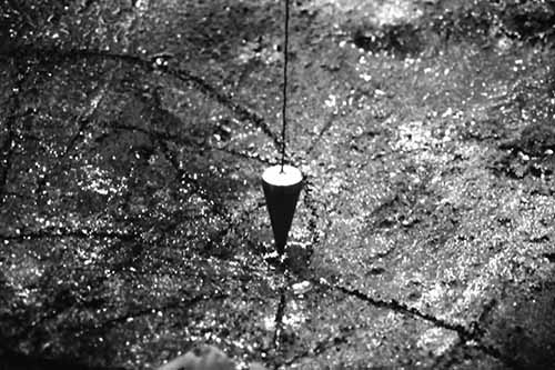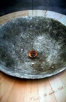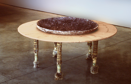 Non-Site Work: Using the silt originally collected at the glacier we created a new work at the Charles Scott Gallery in Vancouver dedicated to the Peyto Glacier and our experiences there. This consisted of a large offering vessel in which we incised each of our own migratory routes over time revealing the processes that shape us. We embedded a magnet underneath the surface of the mapped routes denoting our present location of the city of Vancouver. A pendulum hung overhead centered above the bowl created a diagonal line through attraction to the magnet. The globe–like skirt to the work was done in yellow cedar with hand written text specific to Vancouver. The whole structure was supported with legs wrapped with personal icons.