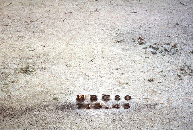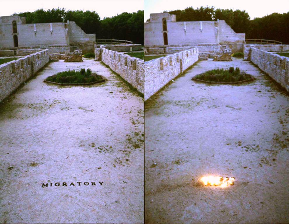 “The first work “Migratory” was done with soil from the area pushed through a language template to form the word. Migratory is an earth notion of many Indigenous peoples and their relationship to the environment. A relationship that denies notions of ownership and is a symbiotic exchange within nature. The language site lasted only a short while for the elements of wind and rain soon redirected and dispersed it.
