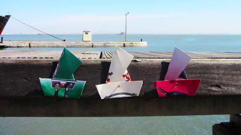 The Nina, the Pinta and the Santa Maria” ... off to conquer a new world to extend Portugese power and territory. We returned the ships to Portugal as ‘territory’ and this gesture was our ‘power’. We nailed them to the Lisbon Port. The boats are constructed from military postcards purchased from the Military Museum in Lisbon, Portugal.