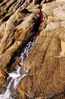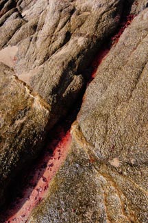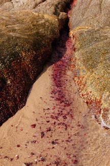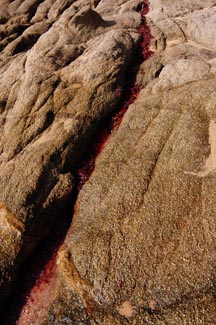 Material: Jamaica (pronounced hai my eik a) – dried hibiscus flowers used medicinally in a tea. We liked the idea of a material that was both about healing and ceremony. We placed the material into the crevice of the rock following the fissure for about 30 feet into the ocean. We placed the material at low tide. As the tides rose the water activated the hibiscus creating a rich fertile red tea that oozed from the stone into the sea. We documented the work as this occurred. The leaves swept out creating new lines in the ocean later washing ashore as a shoreline ... the life-giving blood of mother earth.